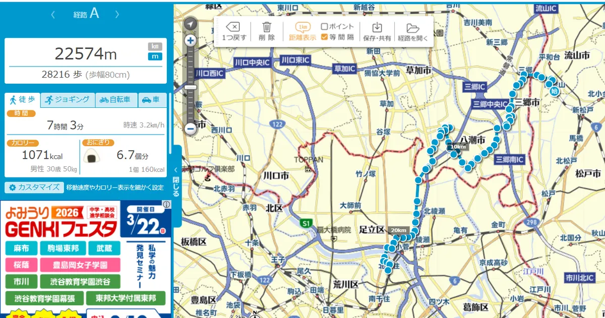 行き帰りの移動とかなんだかんだで結果30㎞、理想と現実は違います。