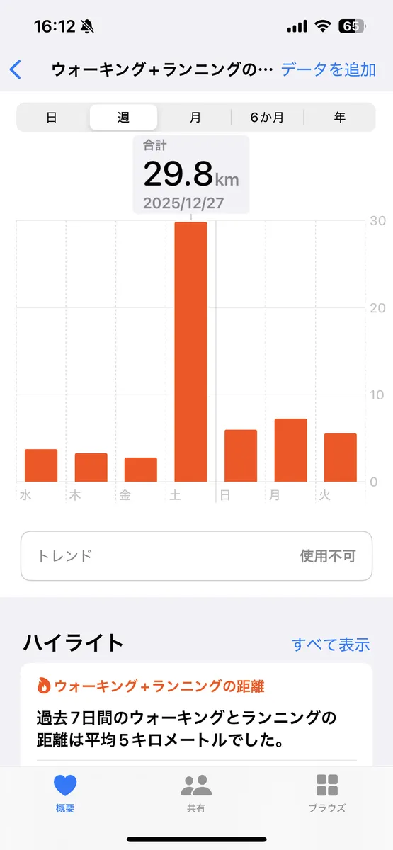 「29.8」って書かれたスマホ画面の毎日の5キロ前後の活動が気になりました。