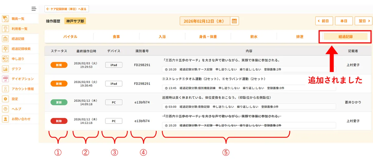 アップデートのお知らせ(2025年11月)でリリースされた履歴機能に経過記録が追加されました。