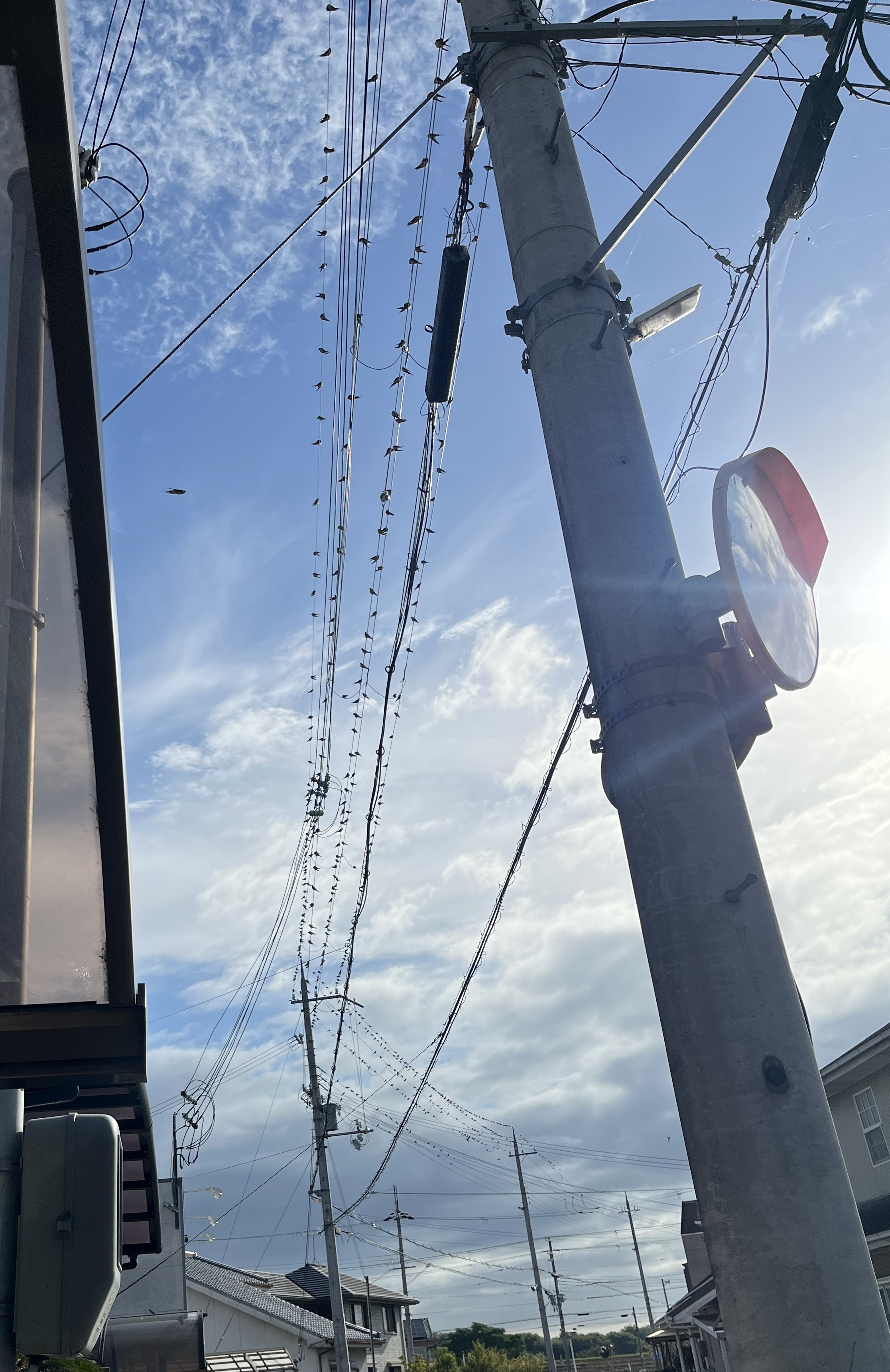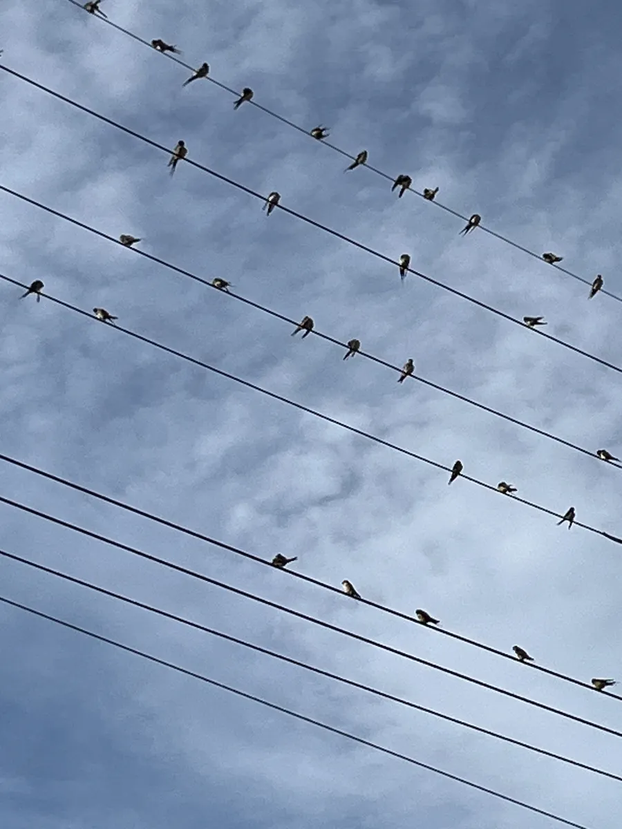 TOP写真は東側で👇こちらは西側に伸びる電線。(出遅れている数羽がかわいい💕)