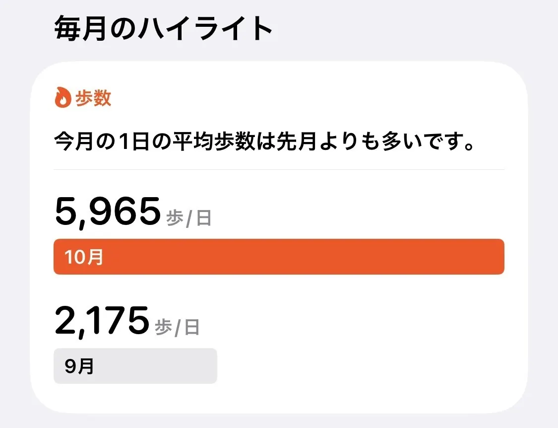 9月の1日平均歩数は2,175歩だったのが、10月はなんと5,965歩に!
