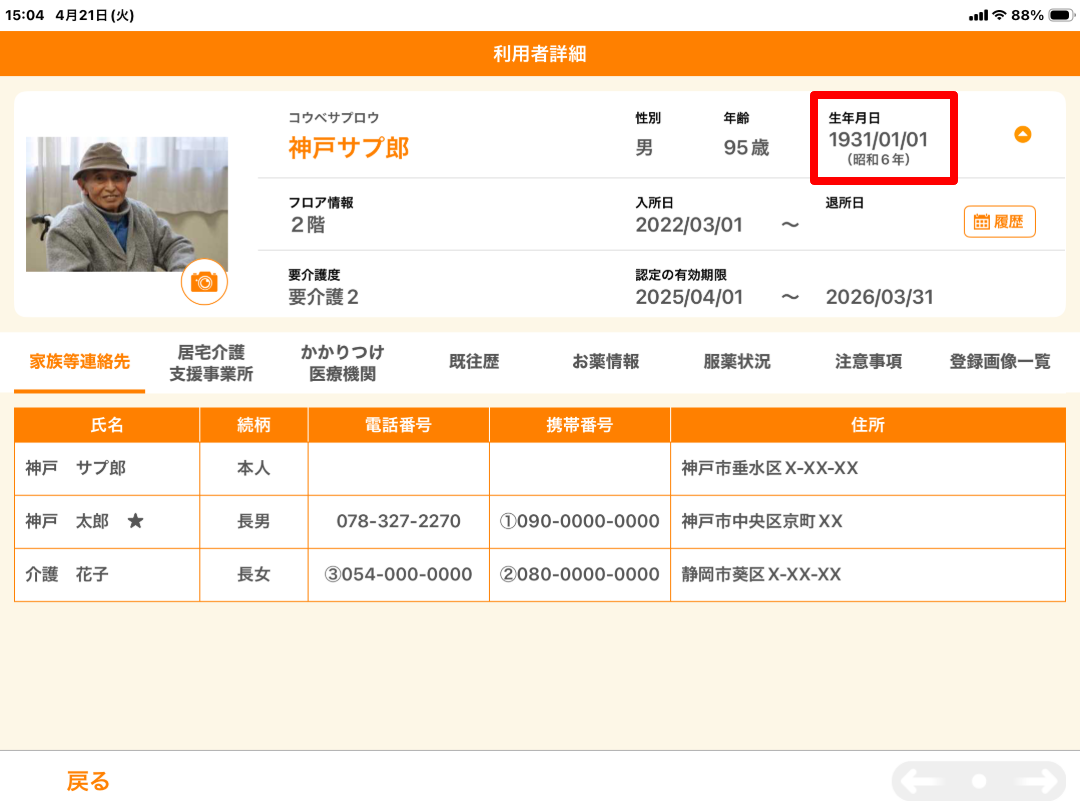 緊急時にiPadを持ち出し、救急隊員や医療機関で利用者の生年月日を和暦で伝えるときや、日常的に「昭和〇年生まれ」と確認する際など、これまで頭の中で変換していた手間がなくなります。