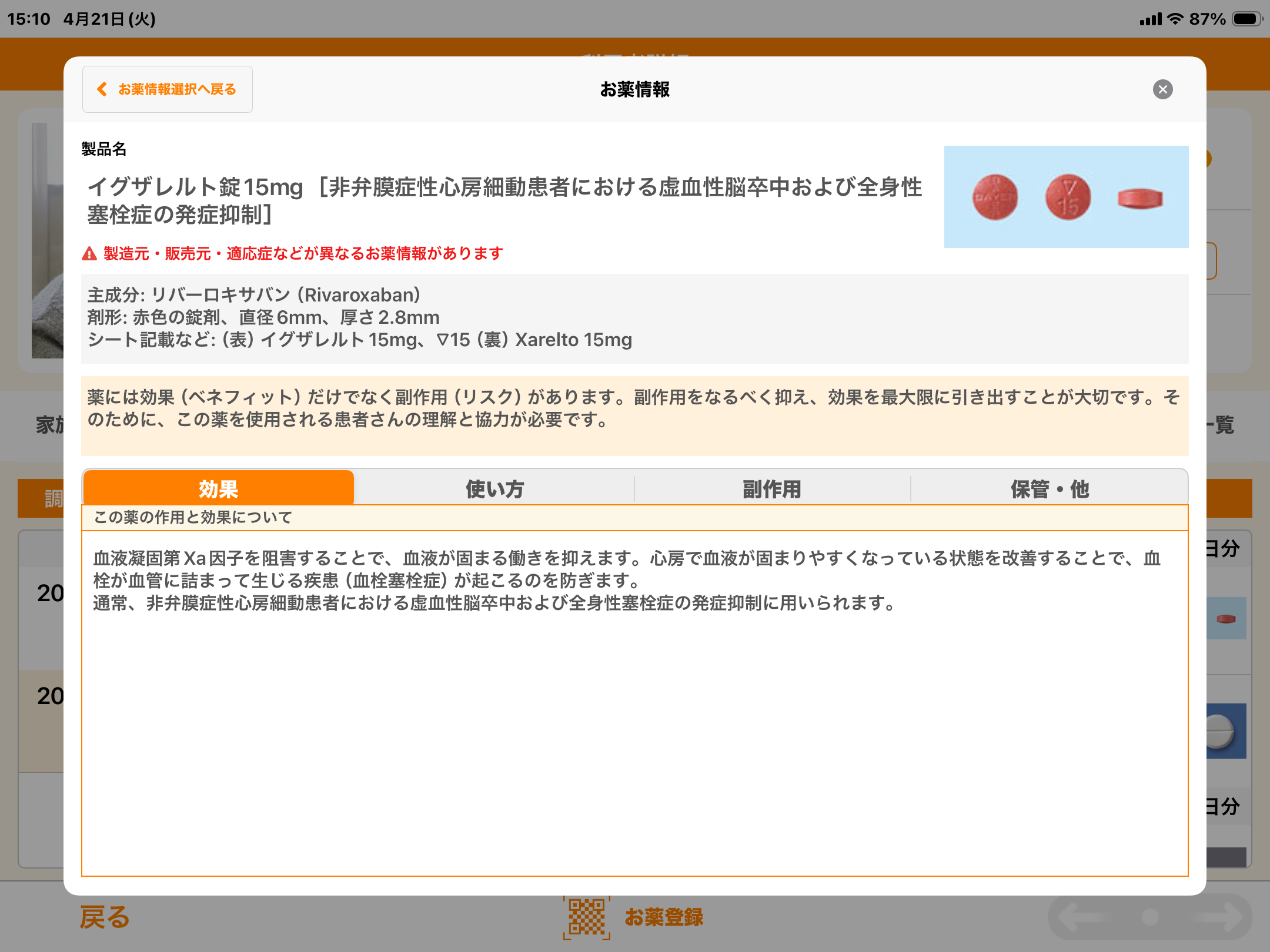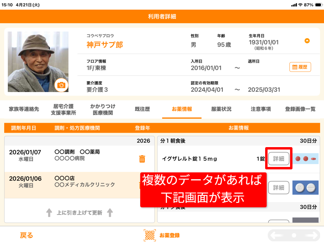 複数のデータがある場合は、お薬情報>詳細をタップした後、