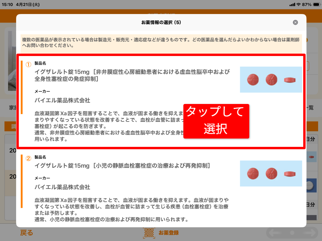対象のお薬を選択する仕様に変更しました。