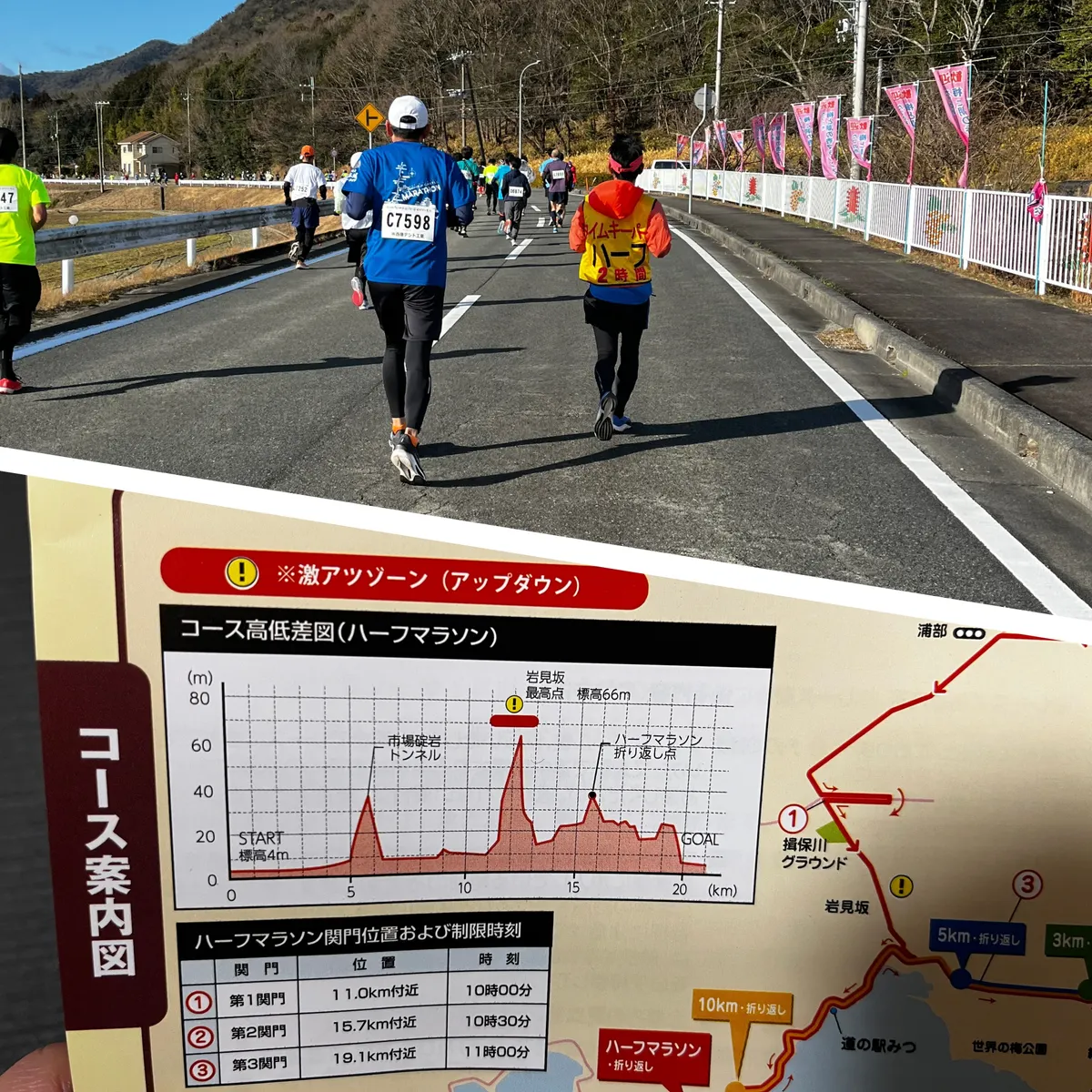 平坦地しか練習してなかったので、長い距離の急こう配の坂がかなりキツかった。『上り坂走るの好きやけど、これはやり過ぎー笑🤣』とか思いながら写真を撮っているうちに、ペースランナーを見失いました。
