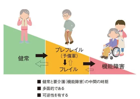 「フレイル」という言葉は、年齢とともに体や心が少しずつ弱っていく状態を表します。元気に生活できる状態と、介護が必要になる状態との中間にある段階です。