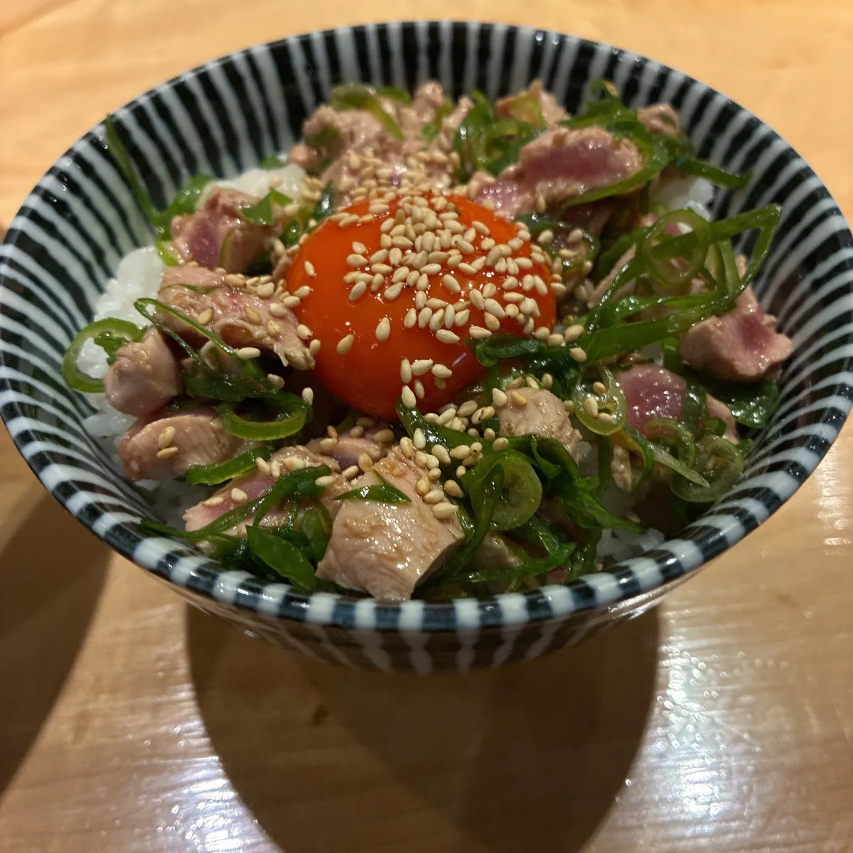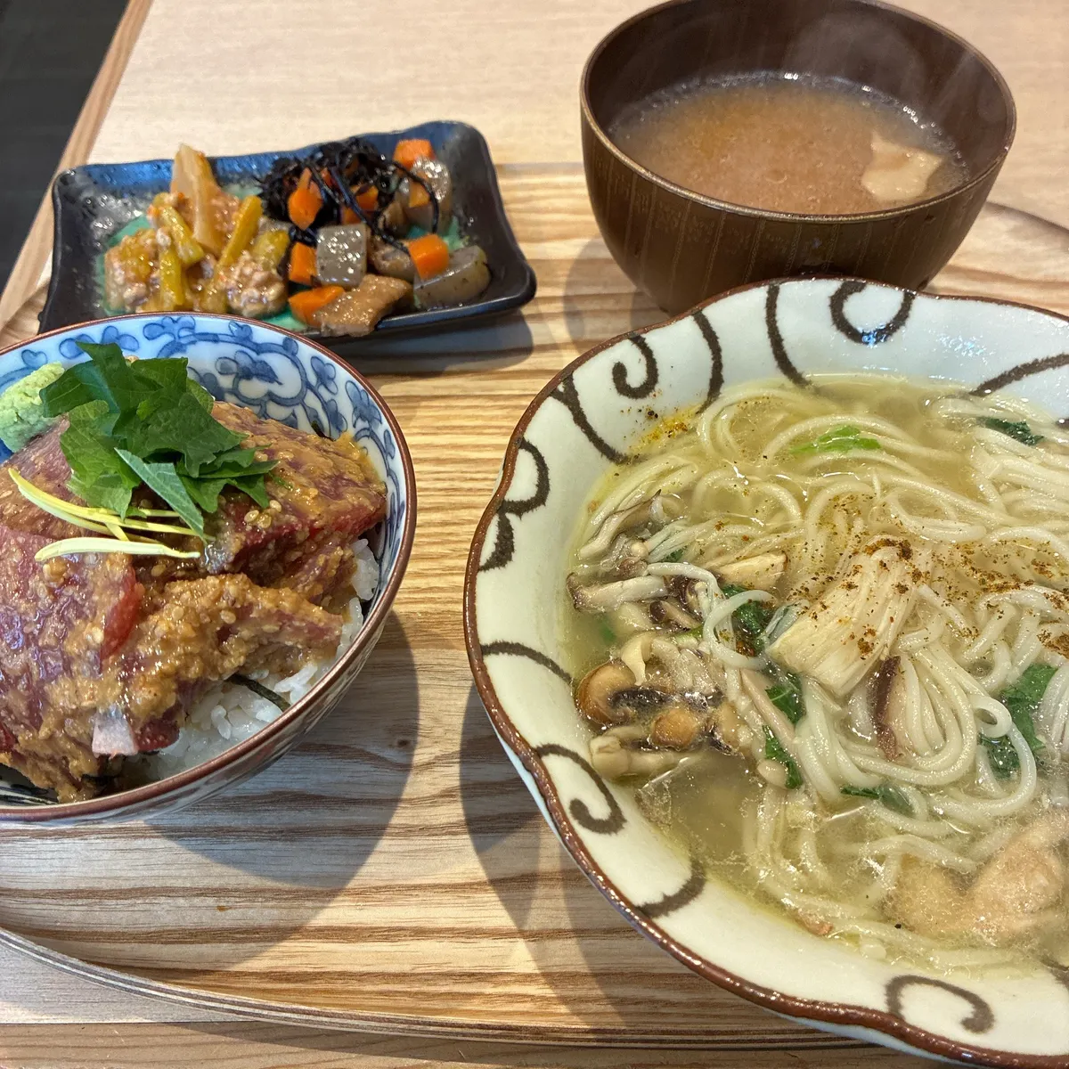 ぶり胡麻たれ丼、鯛出汁そうめんペペロンチーノ風