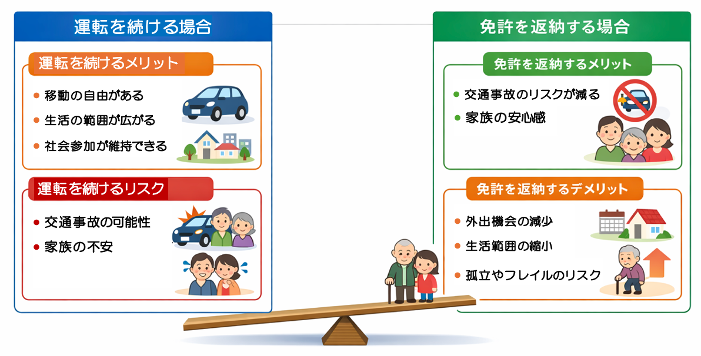 そのため、この問題は単純に「返納するか」「運転を続けるか」という二択ではなく、安全と生活のバランスをどう取るかという視点で考えることが重要になります。