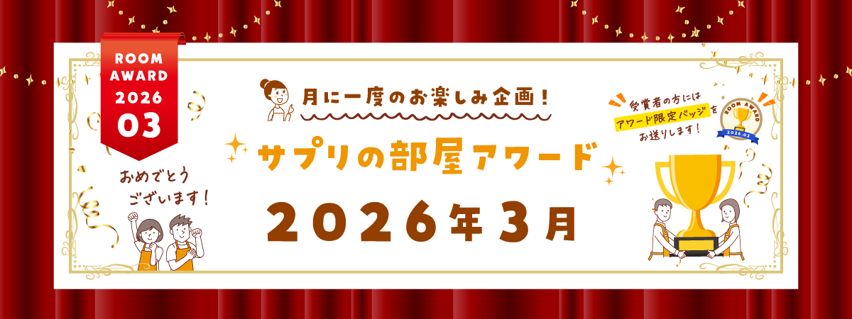 サプリの部屋では、部屋活動を楽しんでくださるユーザーの皆様へ感謝の気持ちを込めて、毎月「サプリの部屋月間アワード」を開催しております!