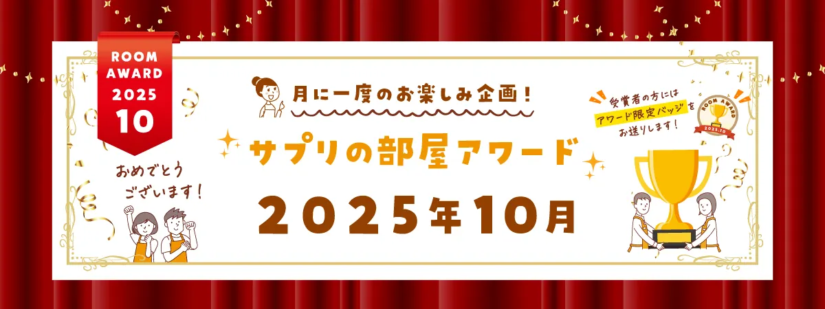 サプリの部屋では、部屋活動を楽しんでくださるユーザーの皆様へ感謝の気持ちを込めて、毎月「サプリの部屋月間アワード」を開催しております!