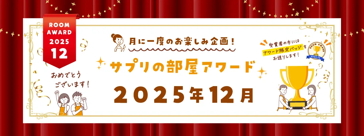 サプリの部屋では、部屋活動を楽しんでくださるユーザーの皆様へ感謝の気持ちを込めて、毎月「サプリの部屋月間アワード」を開催しております!