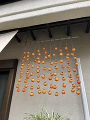 干し柿つくりました🍁 介護サプリの内海です😊すっかり秋になり、イベントや予防接種、衣替え、収穫など、この時期特有のあれやこれやが忙しいですね🎃👻わが家では近所さんから頂いた渋柿で干し柿を作りました。私が仕事で出かけている間の日中に、柿の皮むきや消毒が終わっていて「作りました」じゃなく吊ってるのを「撮りました」です、正確に